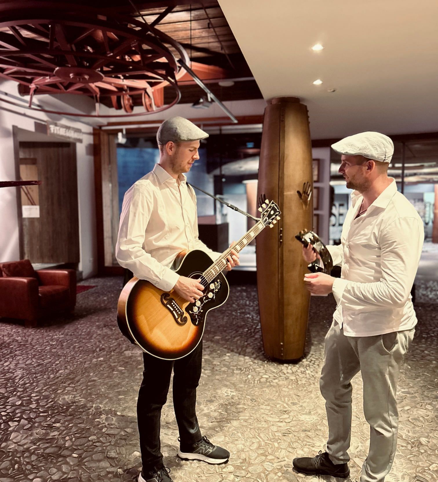 Mit zwei Akustikgitarren, Cajón und doppeltem Gesang schaffen wir heute einen vollen, eleganten Sound – von gefühlvollen Akustikmomenten bis hin zu groovigen Beats für stilvolle Abende, die Gästen noch lange in Erinnerung bleiben.